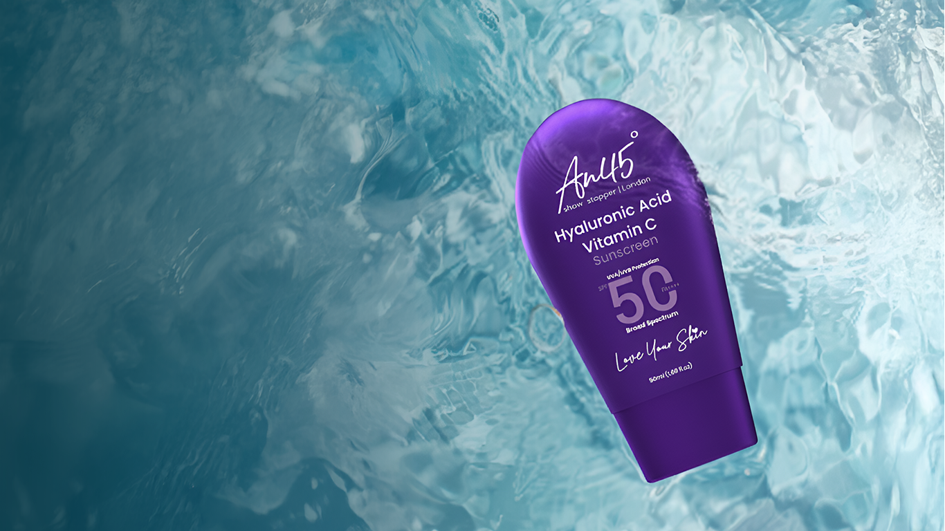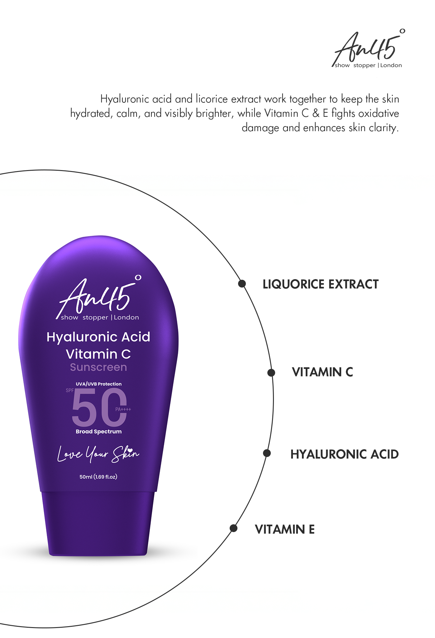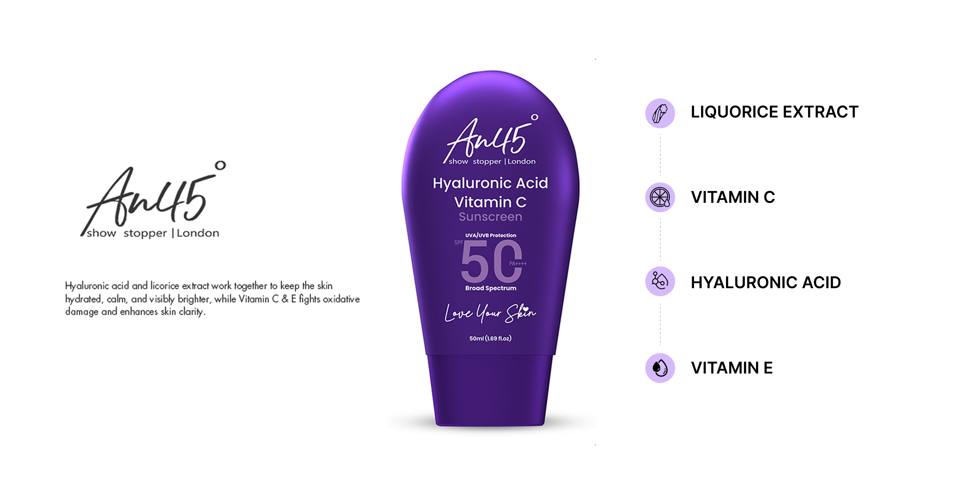 AN45° is where skincare meets daily protection.It is formulated with Hyaluronic Acid to deeply hydrate and plump, along with Vitamin C and Licorice Extract to brighten your complexion and even out skin tone.It doesn’t just block the sun; it combats oxidative damage and enhances skin clarity