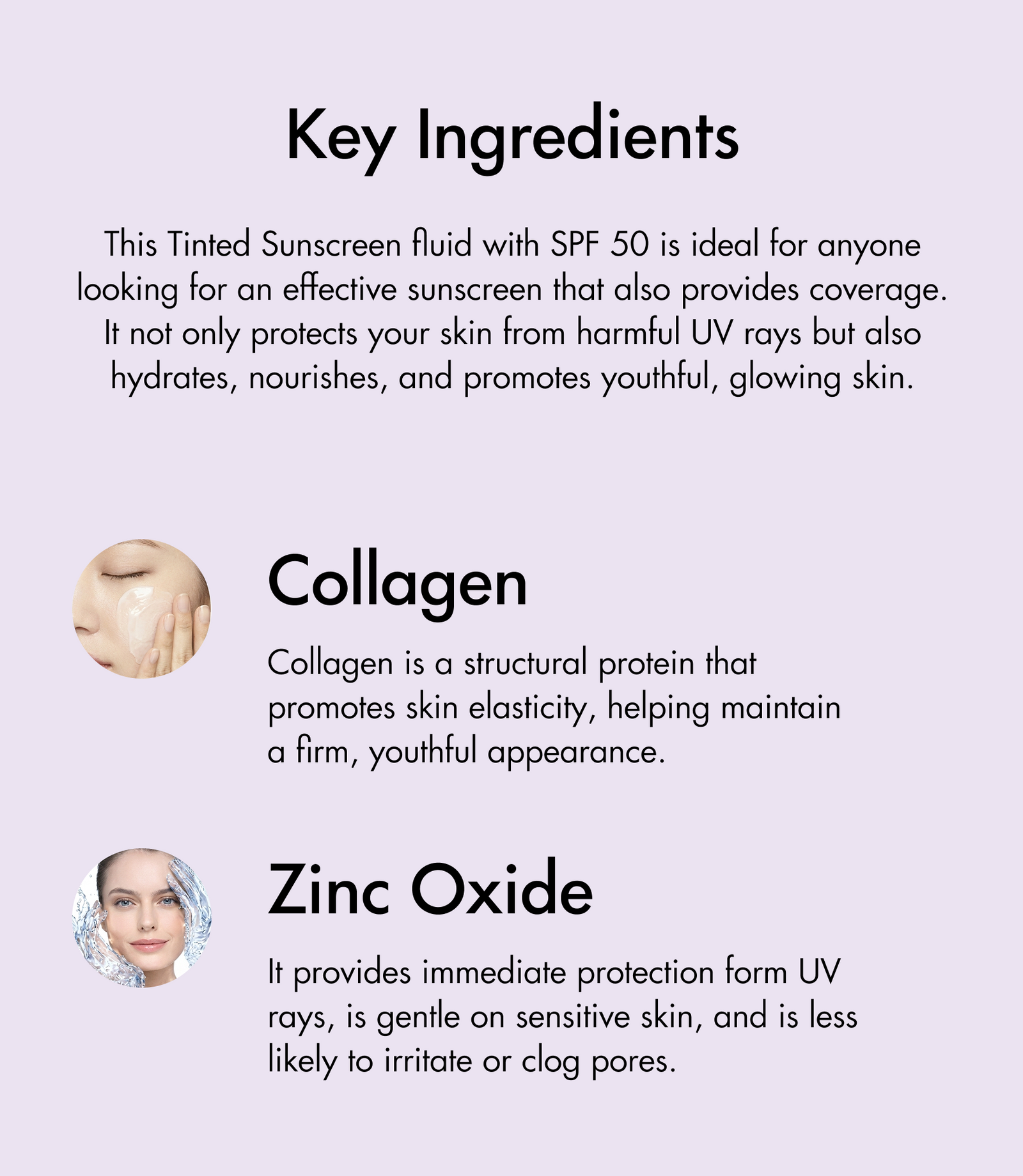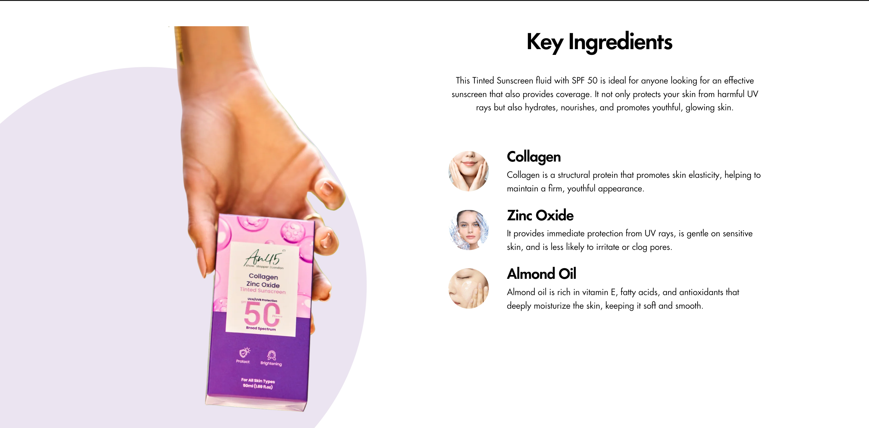 This Tinted Sunscreen Fluid with SPF 50 is ideal for anyone looking for effective sun protection with light coverage. It helps shield your skin from harmful UV rays while also hydrating, nourishing, and promoting a youthful, glowing complexion. With the added benefits of Collagen and Zinc Oxide, this formula supports skin elasticity and provides reliable broad-spectrum protection. Perfect for daily wear, it combines skincare benefits and sun protection in one easy step.
